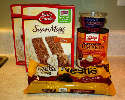 Preheat oven to 350. Mix cake mixes and pumpkin together. Lastly, add in the chocolate chips to the rest of the mixture.