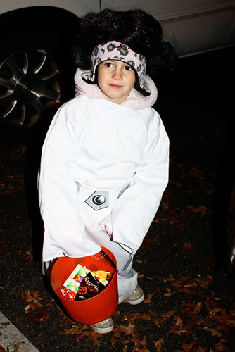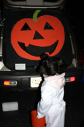 This photo shows what our Star Wars themed trunk looked like before it got too dark. We used huge lightsabers and carved a Death Star pumpkin. The Death Star pumpkin had a laser that ‘blew up’ another pumpkin. Then, we had a large Millennium Falcon we hung from the air. We used some of Nathan’s Star Wars Squinky space ships and figurines to place around the bottom of the trunk.