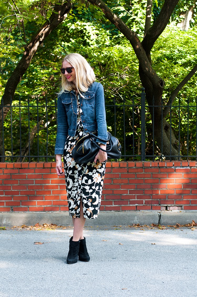 She is wearing a fall floral midi dress with