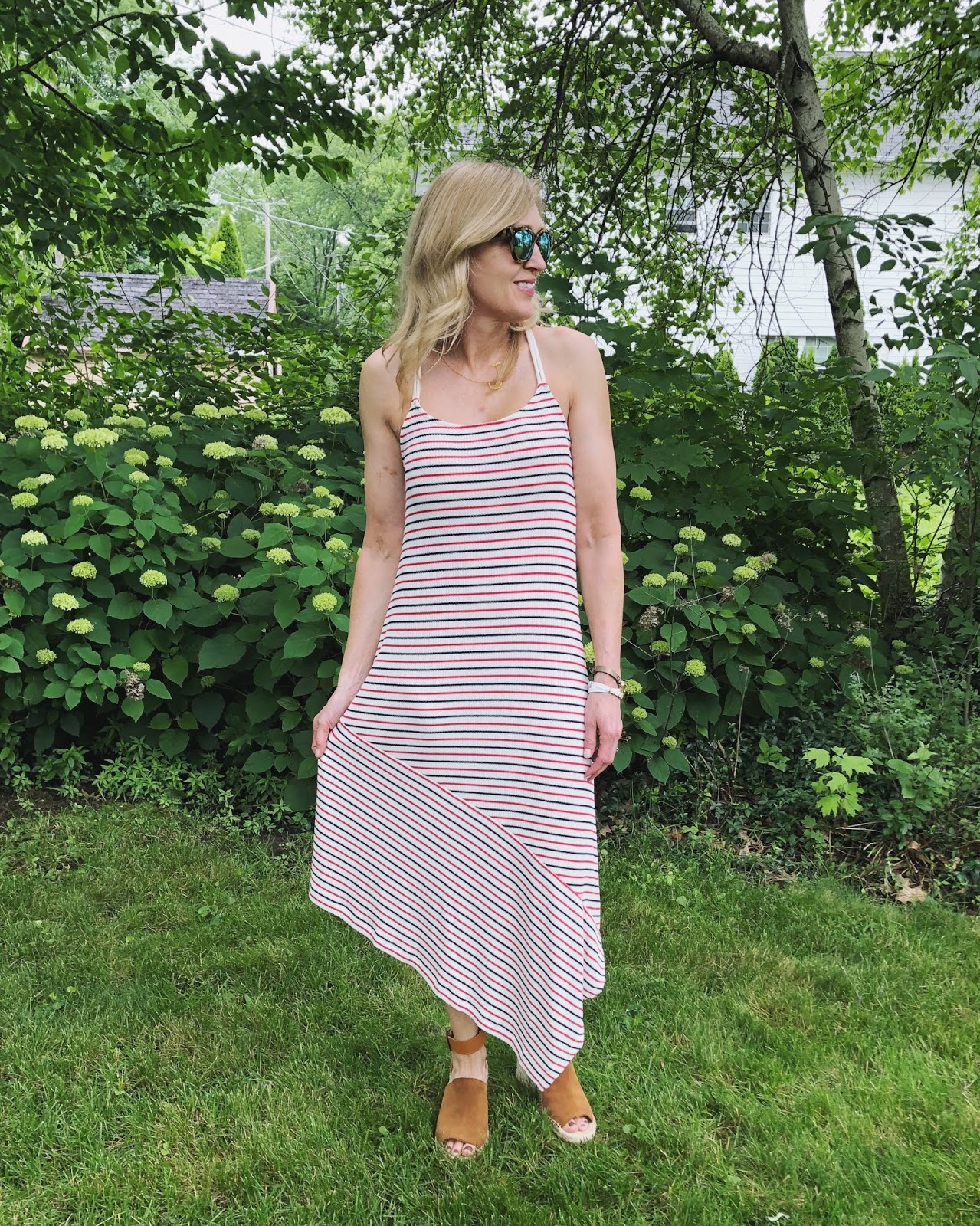 I just love wearing dresses in the summer! For me, dresses are more comfortable than wearing shorts on a hot day. And since we’ve had a string of 90+ degree days lately, they’ve been an easy outfit option. Throw it on and your done! Flats or sneakers dress it down, heels dress it up. No matter how you accessorize, you instantly feel put together! When I saw THIS red and navy asymmetrical stripe dress, I knew I would be wearing it all summer long (it also comes in white and navy stripe)! It’s lightweight, slimming and if you’re traveling, packs well. It would also be perfect to transition from pool to dinner!