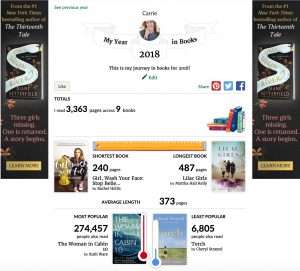 I love keeping track of my books on Goodreads. It is similar to Facebook, but for book lovers. This has been a really busy year and I only finished 8 books (and reading a 9th book). I used to read 28 in one year! I used to do a lot of long distance running on the treadmill and when I stopped that, I also stopped reading so much. I need to find a new way to implement reading time into my day.