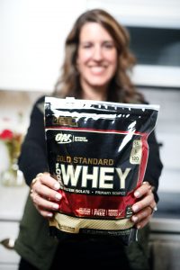 Gold Standard Whey is delicious and easy to mix with a glass and spoon. I usually mix it with cold water, but you can mix it into your favorite beverage. It’s only 120 calories 1.5g fat (or less) and 2g sugar (or less). Gold Standard Whey is gluten free.