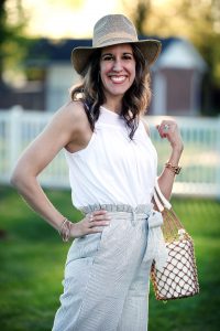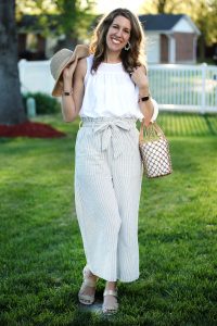 It seems that paper bag shorts and pants are trending again this Spring. I found these French Romance Wide Pants from You and Pio Clothing and fell in love. They’re super comfortable, with their elastic tie waist and wide legs and will be great going into the summer when the humidity hits and we just want breathable fabrics. I paired them with a packable hat, a basket bag (so cute for the Spring!), white scalloped resin earrings and wedges. The perfect outfit for the Spring and going into the Summer! In fact, I’m planning on packing this outfit for when we vacation in Maui! Next Thursday, I’ll be sharing another fun item from You and Pio Clothing. Stay tuned!