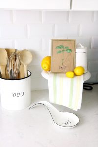 One last kitchen shot… I have a little corner space by my coffee machine with some more of my Rae Dunn goodies. I have a footed metal stand and I always decorate it from season to season. You’ll see a tea towel, lemons, a canister and then another one of those wooden herb signs that I found from the Target Dollar Spot on display (I have several of them and if you look back, you’ll see another one of them on my 2 tier tray).