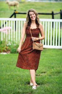 Recently, I went to an outdoor wedding and I decided to style this brown dress with white polka dots for the fall. On the left you’ll see how I styled it for the summer. I added a mustard cardi, the new bag I got from my Fall Box of Style and a pair of booties. I decided to knot the dress to show a little more leg, since it was a midi length.