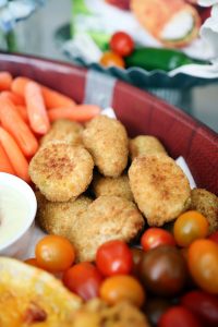 First, you’ll want to find the perfect spot in your home where your guests can mingle and graze. We had our kitchen redone a couple of summers ago and we set up a serving area, which is in-between our kitchen and family room (where our big screen TV is located). This is the perfect spot in our home because it provides an open space, and the guests can grab a snack, mingle by the food, and still keep an eye on the game at all times.