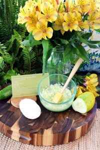 To make this recipe, cut your cucumber into small pieces and use a food processor to mash cucumber. Pour the cucumber mixture through a sieve into a bowl. In a small bowl, mix essential oil and carrier oil. Pour into cucumber juice. Fold cotton round eye pads (provided in this month’s box) in half. Soak in mixture then place in a sealable container and freeze.