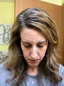 Gray hairs are so pesky and they pop up quickly after a salon visit. That is why I’ve been loving Gray Away for making my hair look its best in-between visits. I’ve found that with my kids home more, it has been harder for me to get out of the house for my 2 hour hair appointments. Plus, I haven’t had as many events to attend, so I love that I can stretch out my hair appointments to 8 weeks (or longer) with this product. In the photo above you’ll see a before photo, where my gray hairs are showing.