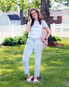 So, it seems everyone is branching out from the skinny denim trend that has been so popular for the last decade and is embracing some looser fit denim styles. I don’t plan to part with my skinny denim just yet, BUT I did pick up this pair of elastic waist, pull-on wide legged denim pants at my recent outlet mall shopping trip. I find wide legged denim just a little tricky to style at times, but I tucked in this fitted tie dyed tee and it worked really well with the wider legs and the elastic waist band on the pants! I call it a total win. You know what else is trending lately? Braided sandals! Of course, Target saved the day by having these super cozy braided sandals that I know I’ll be wearing ALL summer. The reviews said to size up 1 on them, which I did… and, they fit perfectly!
