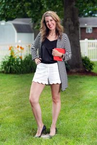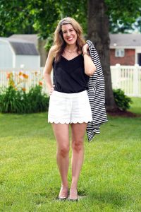 Hey everyone! I have had these white scalloped linen shorts from J. Crew for quite some time and I just never tire of them! Today I did a dressy summer look with them by adding a black lace cami, B/W byline jacket and tall black heels. I feel that as we get into summer, I find it harder and harder to get adventurous with how to style shorts… but, I really liked how this dressier outfit turned out! Plus, the jacket can be easily removed and the look still works! Have a great day!