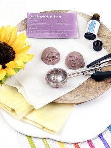 This Fizzy Purple Bath Scoop will fizz once you place it in the bath while it releases into the warm bath water. It is moisturizing and the Peace & Quiet Essential Oil Blend will calm and relax you. To make the Fizzy Purple Bath Scoop, you’ll need 1.5 tablespoons of coconut oil (solid), 1/2 tablespoon fractionated coconut oil, 5 drops Peace & Quiet Essential Oil Blend, 1/4 cup baking soda, 1 tablespoon Citric Acid (included), 2 Tablespoon Cornstarch and 1/4 teaspoon Purple Brazilian Clay (included).