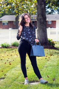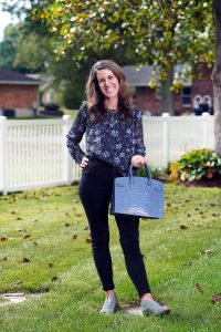 If you’re looking for the ‘All Occasions Top’, the Londyn Boho Smocked Long Sleeve Top from Daniel Rainn is it! This blue floral print top with a dark background has the cutest ruffles. I pulled out some of the blues in this top by pairing it with a blue statement handbag and ankle booties. Give this top a different look by doing a half tuck (like I did here!) or leaving it untucked. This top can easily pull off dressy or casual, depending on what accessories, jeans/pants or bag/clutch you wear with it. As an added bonus, use code CARRIE20 for 20% off your Daniel Rainn purchase!