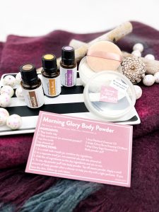 This powder is wonderful to use after you take a shower, to help dry you off with a light perfume. For the Morning Glory Body Powder, you’ll need 1 Tablespoon of Kaolin Clay, 2 Tablespoons of Cornstarch, 1 Teaspoon Zinc Oxide, 1 Teaspoon Almond Oil, 1 Drop of Patchouli Essential Oil, 2 Drops of Citrus Burst Essential Oil Blend, 1 Drop of Clary Sage Essential Oil, Baby Powder Puff and a Small Wide Mouth Jar.