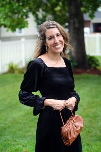 For the second look, I’m wearing a smocked velvet dress with lantern sleeves. It comes in a few other colors, such a really pretty green. I paired this dress with my Teddy Blake pouch and some tortoise heels. This is such a great casual dress for church, brunch and more.