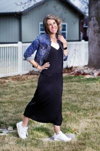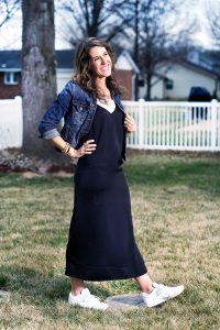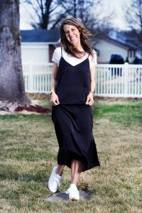 Happy Thursday, friends! I am excited we are into March and the Spring season is getting closer and closer… however, our schedule is going to get QUITE busy this month with dance competitions, track meets, half training for me and the list just goes on and on. But, I’ll take a busy schedule for some warmer weather! Today I’m sharing my new slip dress that I just ADORE and how I’ve styled it casually for the Spring. I layered my favorite slouchy white tee underneath, paired it with white sneaks and topped it with my favorite stretchy denim jacket. I’m sharing some photos of the slip dress without the denim jacket, because it looks great both ways. Slip dresses are SO versatile and can be dressed down like I have done here and you can also dress them up by adding a blazer and heels. Do you have a slip dress yet and how do you like to style it?