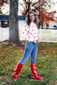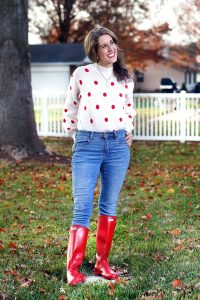 For the first outfit, I’m wearing Chicwish’s Adorable Polka Dot Mock Neck Knit Sweater in White with Red Polka Dots with jeans and red Hunter boots. The playful polka dot print on this sweater will add a touch of whimsy and fun to your winter pieces in your wardrobe. For some more outfit inspo: this sweater would be cute with a red or black tulle skirt, or black slacks and glittery red or gold dress shoes!