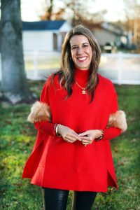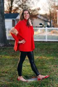 For the last piece from Chicwish, I’m sharing their Faux Fur Sleeve Split Hem Knit Poncho in Red. This is such a CUTE holiday piece with the fur details on the sleeves and the bright red color on the poncho. I love the length, because it covers your bum and therefore I pulled out my Spanx faux leather leggings. I just purchased these fancy dolled up red flats from Target for the holidays. Aren’t they cute? They’re affordable and comfy too!