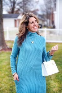 Happy Thursday, friends! WELL, we are in the part of the winter that everyone hates… we are past the holidays and the weather is going to be bitter cold. I’m starting to pull my warmest pieces out of the closet, including this Chunky Ribbed – Tunic Pocket Sweater Dress in Teal c/o Clara Sunwoo. You can be Comfortable Yet Fashionable in this sweater dress and it can be styled up or down. This sweater dress features a funnel neckline, a beautiful warm, light teal shade and a mid-heavy weight fabric that is comfortably stretchy, breathable and vegan friendly.