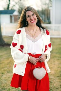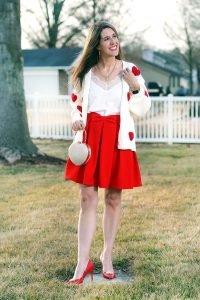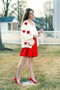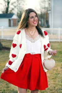 For the first Valentine’s Day outfit, I’m wearing Chicwish’s Romantic Heart Knit Cardi and I paired it with their Bowknot Pleated Skirt. This cardigan has charming heart motifs in a tactile 3D knit, which brings warmth and whimsy to your wardrobe. Then we have this darling red skirt with sophisticated pleats and a bow décor on the front! Brian gifted me a pair of red stilettos for Christmas and I was SO excited to pull them out for this look. I recently purchased a few different glamorous clip ons for my heels and they really elevate the look! I think this look may be my all time favorite Valentine’s Day look I’ve ever shared on here! I already know I’ll be using this red skirt ALL the time for future looks, it is THAT good! I added Chicwish’s Gleaming Heart Shaped Clutch Handbag in Gold to finish off the look.