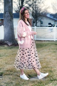 I styled these two pieces for a more casual look, but I’m excited to try out the Heart Soft Fuzzy Knit Cardi with a white tee, light washed jeans and sneaks for a casual look and the Tulle Maxi skirt with a black lace camisole and black heels for a dressy look.