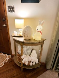 I purchased this new entry table from Amazon and I’ve had fun decorating it each season. I found a little miniature bunny candle in white for my gold tray from the Target Dollar Spot, the initial monogramed egg I already had and then I got this new antique-looking bunny from Target… BONUS: It lights up!