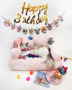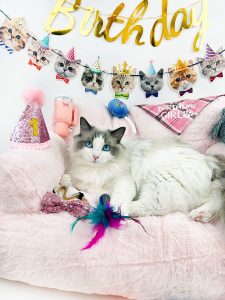Aurora was our second kitten we brought home and she’s Autumn’s cat. She has the same dad as Oliver, but a different mom/litter. Oliver came from a litter of only 3, so he was much more spoiled when we got him from the breeder whereas Aurora came from a litter of 9 and mostly boys! When we brought her home her whiskers were chewed off and she was a tiny little 4 pounds and very wild (as in not handled much) compared to Oliver. It took some time, but she’s really turned into such a gentle and sweet baby girl. Oliver is her best friend and Rose is her grandma! She loves to watch, play and she never fusses for food or attention! She loves to lay in her condo by the window and watch the birds, flowers blow in the breeze and the leaves falling of the tree. She is our very mellow/chill cat and really is just so easygoing. We just love her so much! She looks tiny here, but she is now 12 lbs!! Ragdolls get big, even the girl cats!