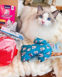 In August, they received the Kitty Wellness box and I think it was my favorite one out of these three I’m sharing in this post. Ollie Bear LOVED the red brush and the thermometer, pill and scrubs toys were SO, SO cute! They received the Vitakraft Lick ‘N’ Lap treat again, because they loved it so much the month before. I also lucked out with this SUPER CUTE photo of the two of them! It is hard to get photos of them some months, but they sure were in the mood on this particular day and were extra cute.