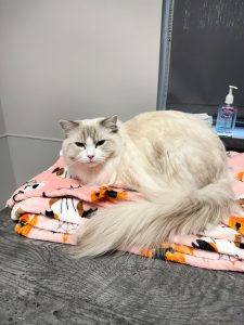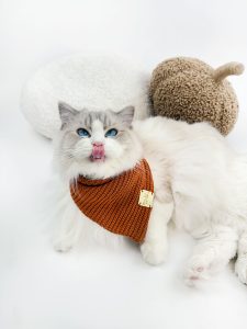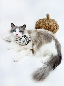 Aurora is wearing the Halloween bandana. Not only was it hard to get her to pose, because she just wanted to rip the thing off, but she’s so fluffy I had to make sure her hair was tucked in around her neck so you could read what it says. LOL. Whew! I was exhausted after I did this mini photoshoot session with them… and never again! So, a little about Oliver and Aurora… they are both ragdolls and one litter apart, 2 months apart in age. They are half siblings and actually have the same dad!