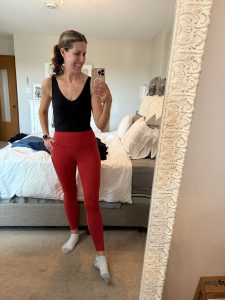 The Down To The Wire Tank in Black ($69.00) fit nicely, but it was SO scratchy and cheap feeling that I thought I could do better. I usually prefer sports bras over fitting sports bra tankinis anyhow. The High Waisted 7/8 Tight in Spice ($88.00) was a fun color, but I found something on Amazon in more of the red color that I was looking for… these looked more coral in real life (they look more red in these photos). Then in the photo on the right I added the Carefree Solid Hacci Cardigan in Black ($78.00). LOVED, LOVED, LOVED this throw on piece and it would be perfect in the morning when I throw on my workout clothes first thing in the morning and it is a little chilly in the house or it’d be great to wear as a little coverup outside the house if I have my workout clothes on. However, I looked at the washing label and it was wash separately, lay flat to dry and NO iron. It just seemed to be a little too much for an athletic piece that I may need to wash often. So, I passed on it! The fabric also seemed like it could pill easily. I really wanted to love the cardigan, though!!