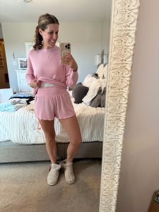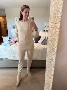 I really loved this Dreamy Hacci Pullover ($68.00) and the matching Joggers ($68.00) ((Photo on Left)) in Oatmeal. But, I just didn’t love the oatmeal color on me. If it had been in a different color, I think I may have kept it. It was SO soft, fit just right… and I could see myself in it most nights! The Monique Solid Knit Cami Short Set in Black ($58.00) was a hard no… I just didn’t like the fit/style on me… and it felt super cheap/thin.