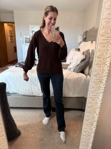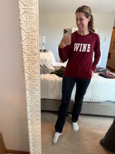 Like I said above, I only kept one piece from each box. The winner of the Style Edit box was this Wine Graphic Pullover in Cabernet ($68.00). This piece I saw on their Instagram and I requested it. When it arrived, I fell in love with it. I thought it’d be more of a t-shirt thickness, but it almost reminds me of a sweatshirt thickness, but more of a t-shirt feel (if that even makes sense).