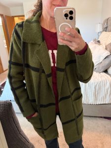 Next we have the Plaid Sweater Coatigan in Olive/Black ($88.00) on the left and a Floral Popcorn Cardigan in Charcoal Floral ($69.00) on the right. The Plaid Sweater Coatigan was just a dream… I loved the length, the soft sweater feel of it and it was really cute for a fun layering piece for the outdoors. But, I went back and forth with myself and decided I didn’t need it. I thought I’d love the Floral Popcorn Cardigan more, but I put it on and it just felt a little frumpy on me and was a quick no.