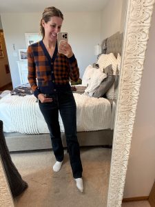 Next we have the Plaid Cardigan in Navy and Orange ($59.00) on the left and the Kennedy Straight Leg Jeans in San Dimas ($109.00). The Plaid Cardigan may have been more tempting if I had seen it at the beginning of fall with the orange color, but I feel we’ll be getting more into ‘Christmas’ colors soon. I’m not a huge fan of straight leg jeans on myself… so it was a quick pass for me.
