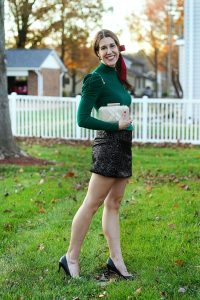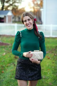 For the first look, I’m wearing Chicwish’s Rhinestone Ruched Shoulder Top in Green. This stunning green top features a chic mock neck, playful ruched bubble sleeves and sparkling rhinestone accents. The rhinestones add a little sparkle and bling for the holidays, which I love! I’m wearing this top with Chicwish’s Sparkling Sequin Belted Skirt in Black, but this fitted top would also look great with a pair of wide legged trousers or a pair of dressy dark denim. The skirt is mini (but not overly mini and I’m 5’7″) and is adorned with shimmering sequins and has a belt that will cinch your silhouette beautifully.