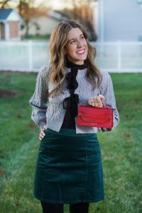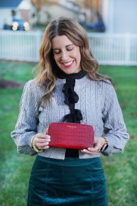 Shop This Look:For the last look, I’m styling my new Teddy Blake Pia Vitello 8″ Bag and their TB Zipwallet Croco, both in Dark Red (perfect for the holidays!). The Pia Vitello is the perfect compact size for all of those holiday errands AND parties. It can be worn with its handle, or as a crossbody bag with the strap it comes with or remove the handle and use it as a clutch. The TB Zipwallet Croco is the perfect size for all your cards, bills, etc. and has a matching red interior and gold toned hardware. Both the bag and wallet are made in Italy. I also wanted to mention my bow tie sweater I’m wearing, this Cable Knit Sweater Bow Tie Front Sweater Amazon and WOW did it check ALL the boxes. I wore a thin black turtleneck under it, the bow ties are secure and I love the flouncy, oversized sleeves!