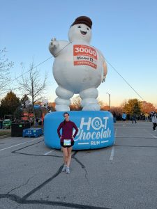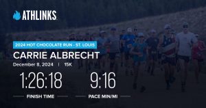 After my fall half marathon (The Great GO! Halloween Half Marathon), I decided to sign up for a couple of winter races. I signed up for the Hot Chocolate 15K and the 4 Mile Kirkwood race (part of the Snowball Series I did last year with Nathan). I’m covering both of these races in this post, starting with Hot Chocolate first, because that race I trained for with my coach and I succeeded in hitting my goal pace! Yayyy! I took a few weeks off from my coach after my half marathon to rest my body. I still ran, but I didn’t do the long runs or any speed/tempo workouts. Then, with my coach I trained for about 4-5 weeks for the Hot Chocolate. I was still fresh (ha, ha, don’t you love that word?) from just finishing half marathon training and I trained hard till the Hot Chocolate race date of December 8th!! I lucked out with BEAUTIFUL weather for December, it was sunny and only 44 degrees at the start. I had trained in much COOLER conditions, so this was GREAT weather for race day! I will say, I think I hate winter training more than I hate summer training. But, ask me again in the summer and I may change my mind on that. Ha, ha! The course was VERY hilly, which pretty much every race here in St. Louis is hilly!! But, I think I did really great with the hills, even though every time I finish a race I tell myself I need to do more hill training!