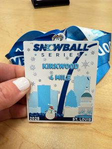 Now I’m going to recap a smaller race I did, the Snowball Series: Kirkwood 4 Mile Race. I did the entire Snowball Series last year, which consisted of 4 races in different locations with different distances (all 5 miles or under) in the months of January and February. The races are every other week. Last year, the Kirkwood race got canceled, they tried to reschedule it and it got canceled AGAIN due to ice. SO, I didn’t want to do the entire series again this winter, but I did want to do the Kirkwood race. Kirkwood is a really cute area in St. Louis and I really wanted to run the route. Once again, it was a HILLY course… super hilly… with some good downhills too! However, the challenging part was that we got this HUGE ice storm on January 5th with a good 4.5″ of ice with 4″ of snow on top and then a very cold weather system that lasted for weeks after… I was surprised they still had the race, because there were large sections of the race where we had to walk, due to all of the black ice. I slipped several times and I had to slow WAYYY down, I did not want to fall and injure myself. I’m 47, that would just to be good. Ha, ha! I will say, they did have people at each spot where there was ice and they warned us and told us to walk. But, still… it was a bit of a bummer, because it really wasn’t a ‘race’, more of an obstacle course! Ha, ha! It was all good though and I think we were all just excited to get it in, after the fact.