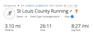 I did this race on a trail by my house, so I’m not going to include the map, but this is what my Garmin gave me for my 5K time. I had an 11 second PR, so it gave me a little trophy! One goal for this race was that I wanted to get my first 7 minute mile during the first mile. I did it! Even though it was close at 7:58!!