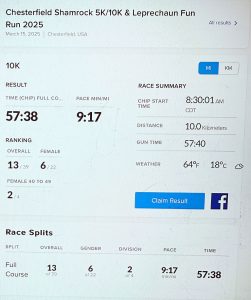 Here are my stats for the Chesterfield Shamrock race. I recently ran a 15K faster than this, but AHWELL. You win some and you lose some.