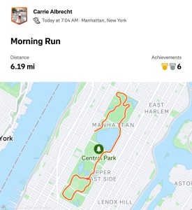 I use Strava for my runs and here is a map of what we ran. Unfortunately, we turned onto Terrace Drive by mistake, so we got a little turned around. The entire loop around the park is 6 miles, but we did 6.19 miles by going down Terrace Drive and then we didn’t make it completely around the park. There was some REALLY neat things to see on Terrace Drive though, so it is worth checking out if you decide to run along it. We got close!! There is a REALLY great blog post that tells you how to run the Central Park Loop and explains what you’ll see along the way and you can find it HERE. It helped me a lot to read this before we went. It also tells you that 99% of the people run the park counter clockwise, so there is a direction you’ll want to run it in once you enter the park.