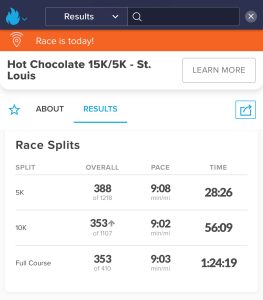 Here are my race stats for the 2026 Hot Chocolate 15K: