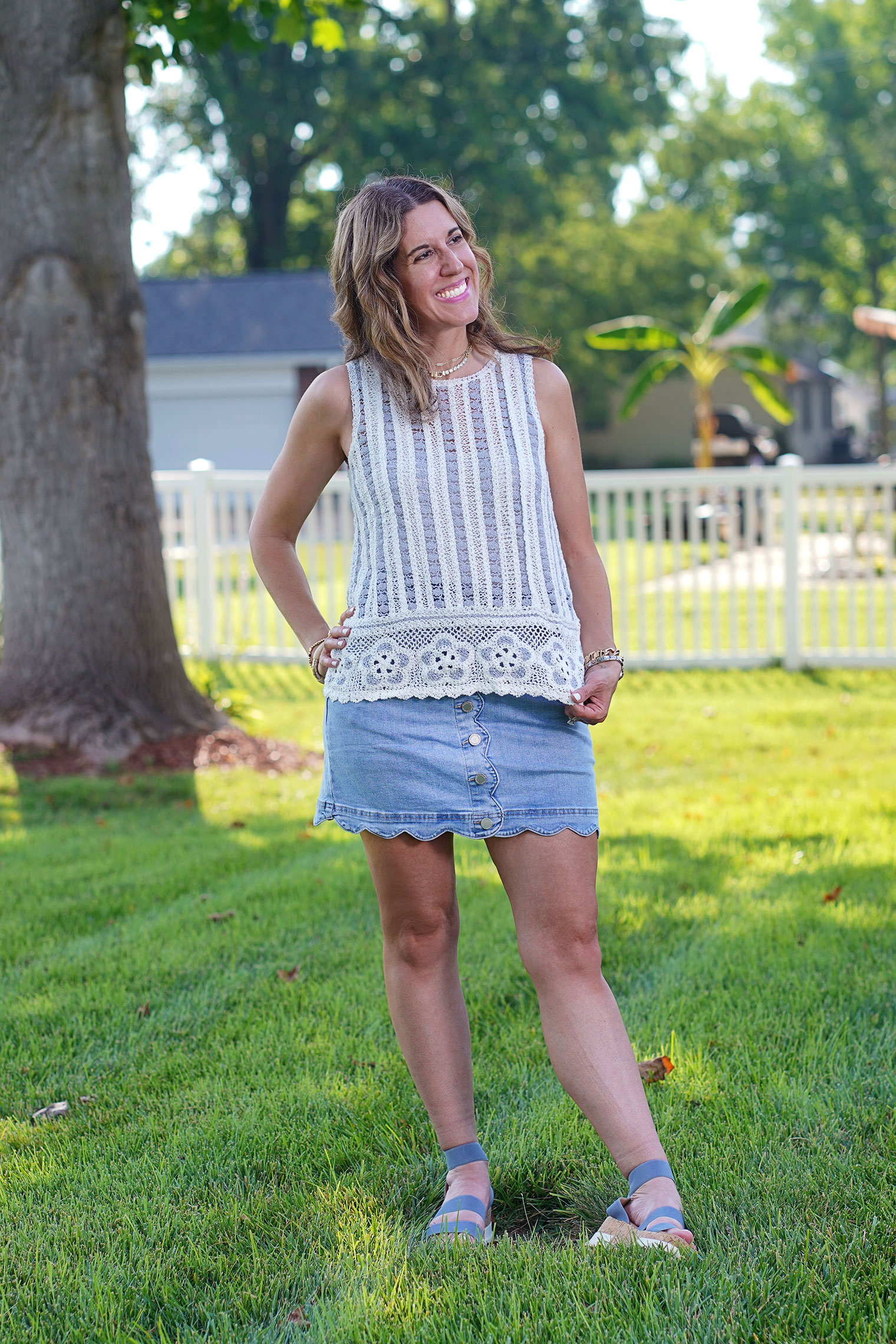 Summer Lovin’ Crochet Top with Adorable Scalloped Hem Button-Front Denim Skort